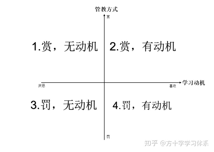 而且实际上,“外部管教”的能力也是有限的。为什么呢?我们从“有无学习动机”与“赏罚”所构成的4个角度来分析: