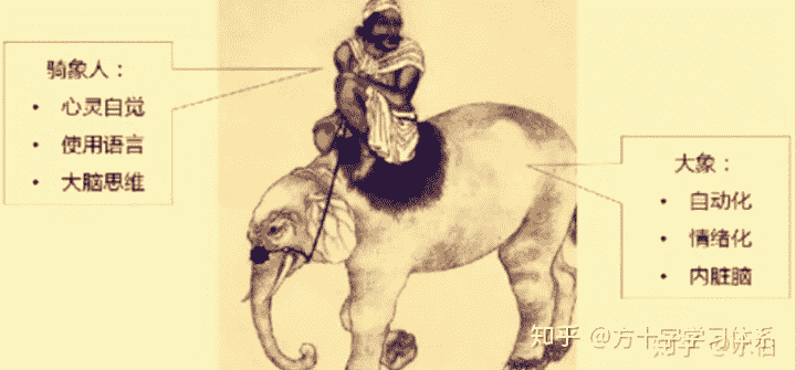 人类的情感与理智,就如大象和骑象人:骑象人(理智)希望走向自己的目的地,但存在惰性的大象(情感)却不听使唤仍在原地踯躅不前。 头脑(骑象人)是生活的方向盘,情感(大象)则是生活的动力源,而环境则是生活的公路,给骑象人提供方向。三者结合,改变就能发生。——[美]Jonathan Haidt《象与骑象人》