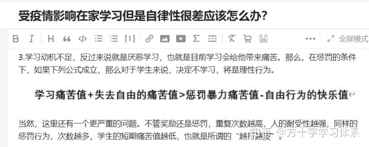 首先,我们承认,合理的外部管教多数情况下比要求学生自己自律更有效果。这也就是在家学习的效果不如在校学习的效果的原因之一:缺乏了学校管教,外部管教被大大削弱,在学习动机不足的前提下,对学生的“意志力”要求大大提升,而人的意志力是有限资源,难以短时间内增长。