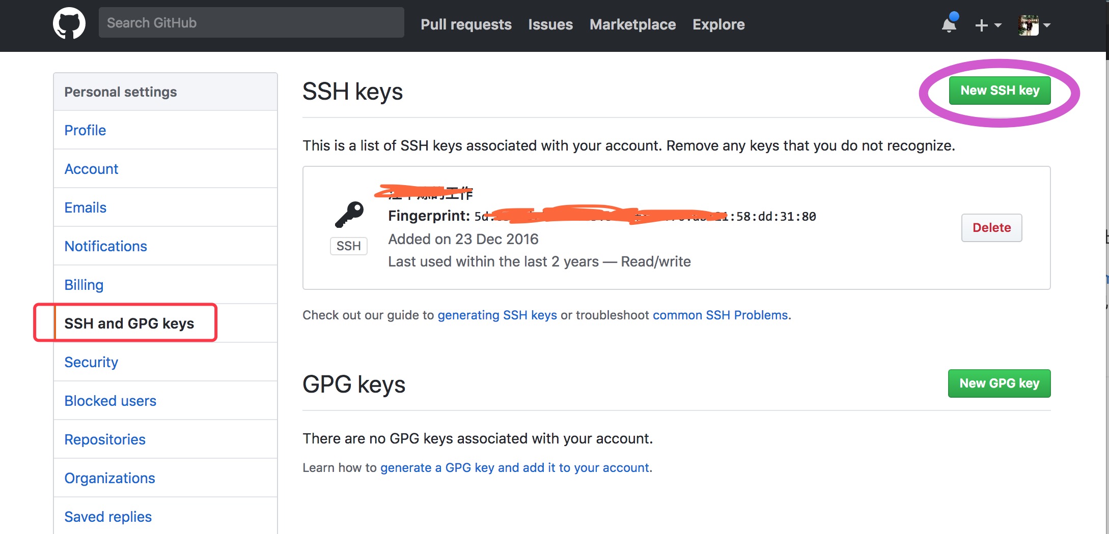 • 终端查看 .ssh/id_rsa.pub 文件, 然后复制里面的key.